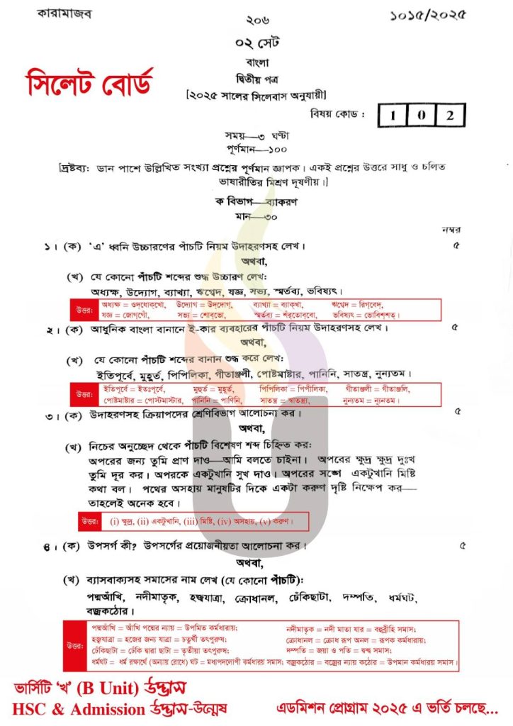 ৬. সিলেট বোর্ড বাংলা ২য় পত্র উত্তর ২০২৫ | Sylhet Board HSC Bangla 2nd Paper Answer 2025